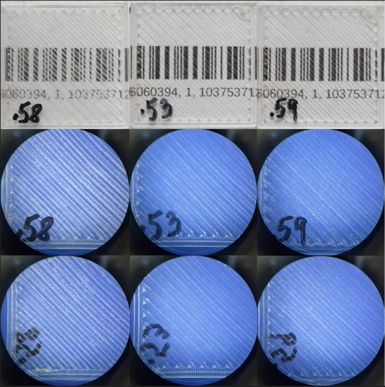 Given the above explanations of our knobs that we're turning, we can see the result each has on the overall print. The images below are all the same model: a 1mm thick 25x25mm square. The left, middle, and right columns will be prints containing a low, medium, and high value, respectively for the given parameter in the heading. The first row is the print laying directly on a barcode and the second and third rows are images of the bed layer and final layer of the print, respectively.
